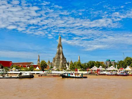 チャオプラヤー川沿いにそびえる美しい仏塔は、バンコクを象徴する景観のひとつ。