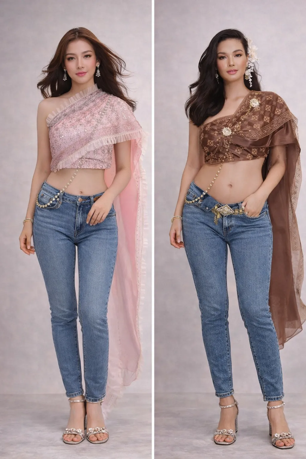 A trendy Thai fashion style. Rent the traditional Sabai top and combine it with your own jeans for a modern Thai look.